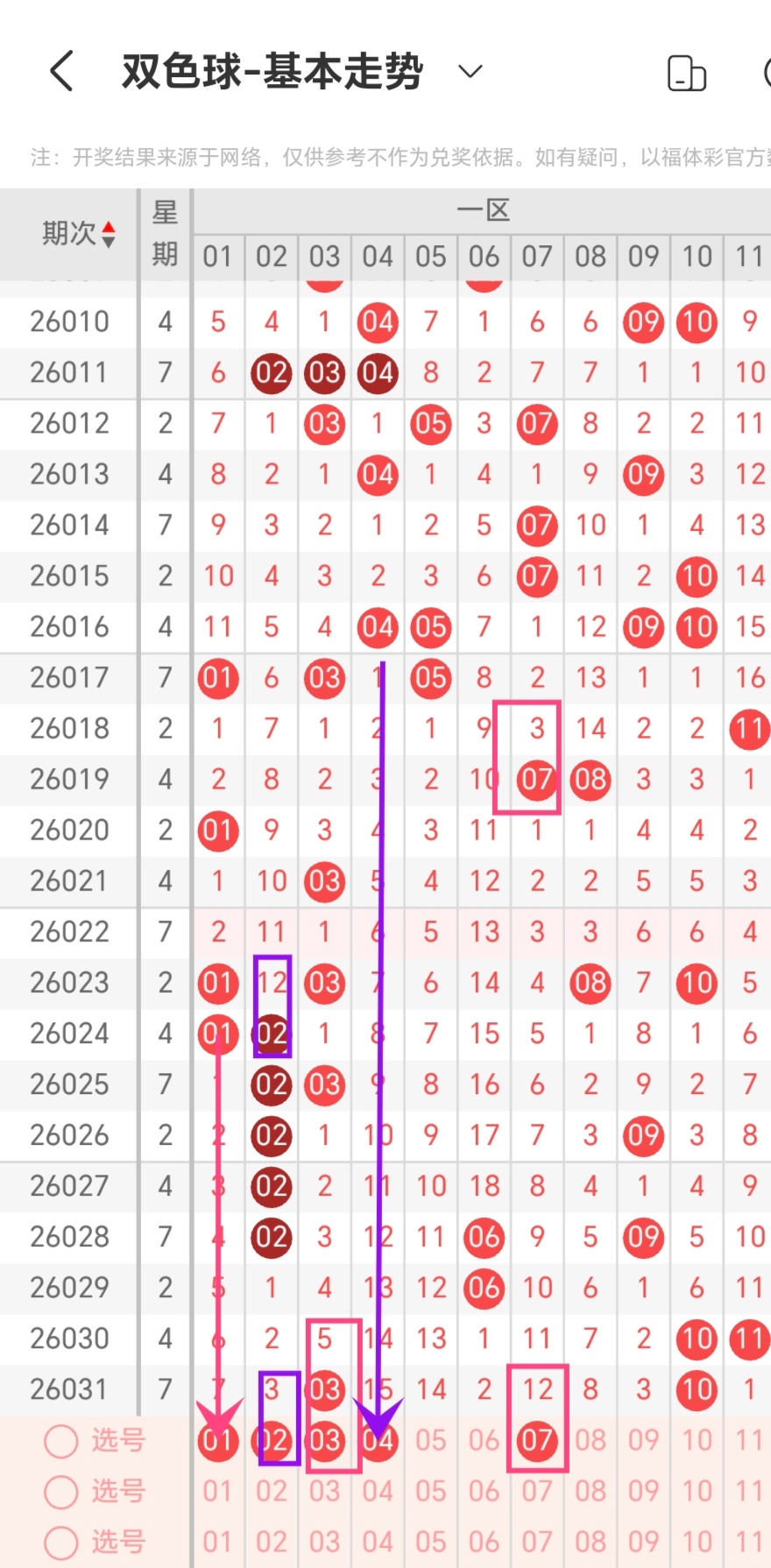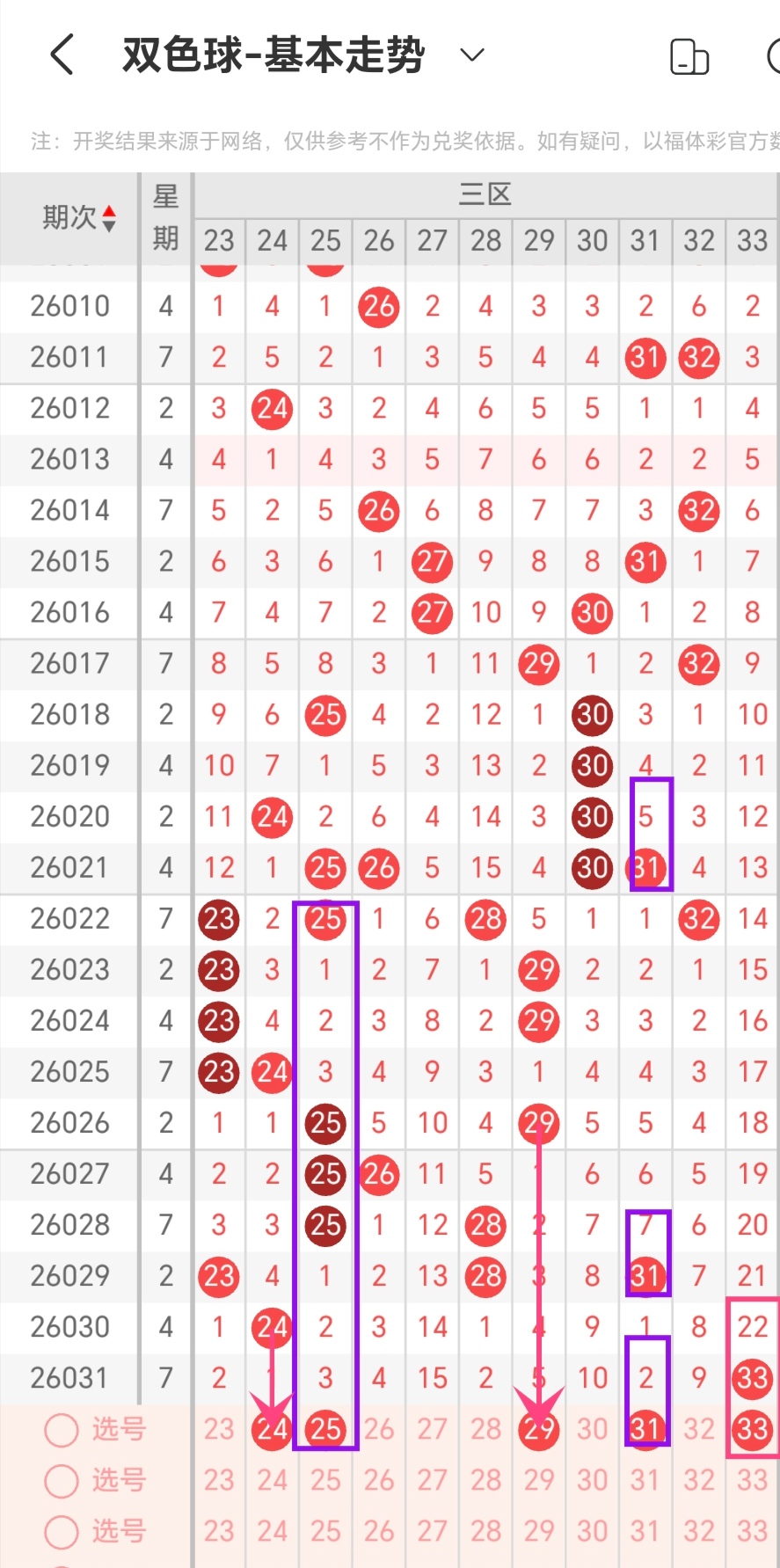 通过对同星期周二重号出现数量规律进行统计分析,本期考虑出号0-1个,即06-19-22-23-28-31出号0-1个