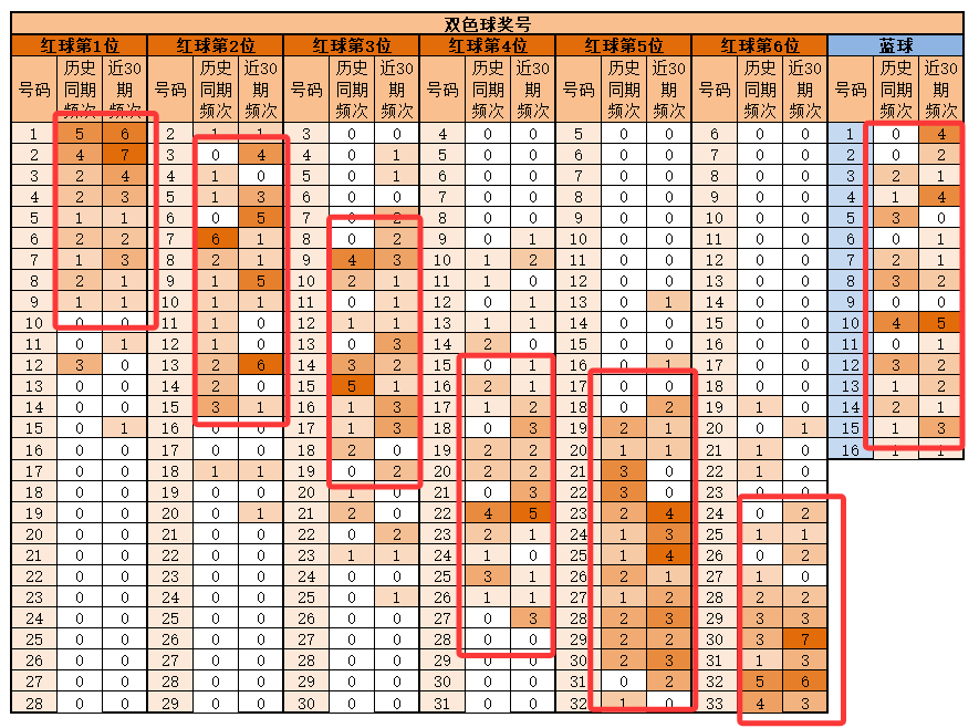 第6位,基本在24-33之间,历史同期频次最多的32;近30期,频次最多的为30,明显特征是合数优势;推荐重28-29-30-31-32-33。