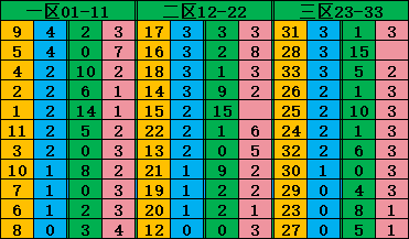 三区23-33号:出现0次的位置对应本期号码是:28号。