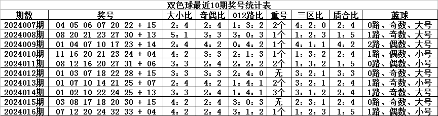 双色球第2024016期开出奖号为:07、12、20、24、32、33+04,其中红球号码奇偶比为2:4,大小比为4:2,012路比为3:1:2,和值为128,跨度为26,三区比为1:2:3,开出1个重复红球:20。蓝球开出偶数、小号、1路。