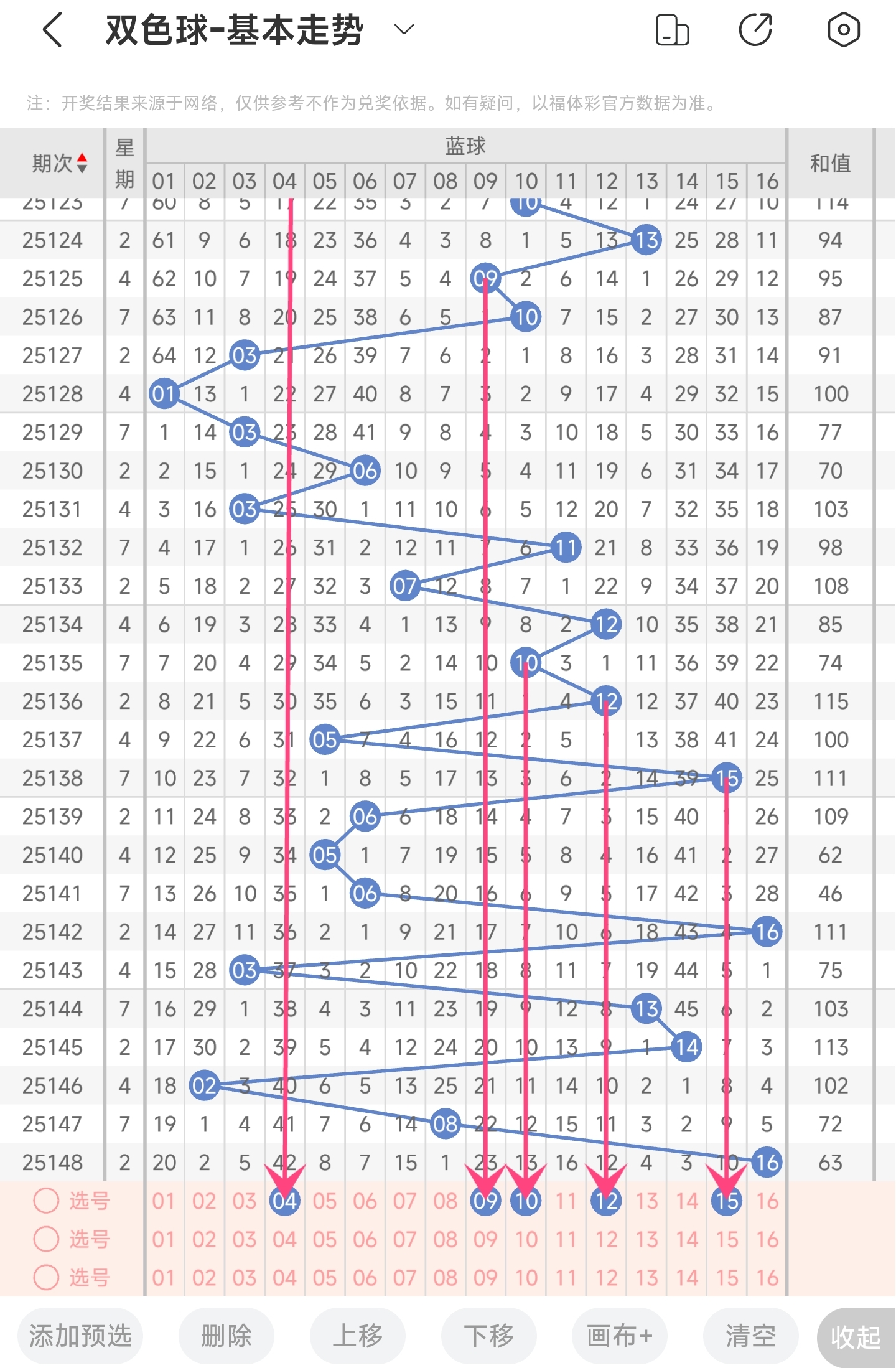 上期开出的是16,往前一期开出的是8。趋势往右偏移,偏移量为8,偏移量比较大大。通过分析目前蓝球的走势图,目前的趋势是明显往左的了。从偏移量来看,最近几期偏移量都是比较大的,本期重点关注比较大偏移量的号码,防一下小偏移量的。同时最近冷号回补概率比较高,注意一下。最后再结合遗漏期数,以及冷热号,本期我们可以关注49101215等号码。综上所述本期推测可能开出49101215等号码。