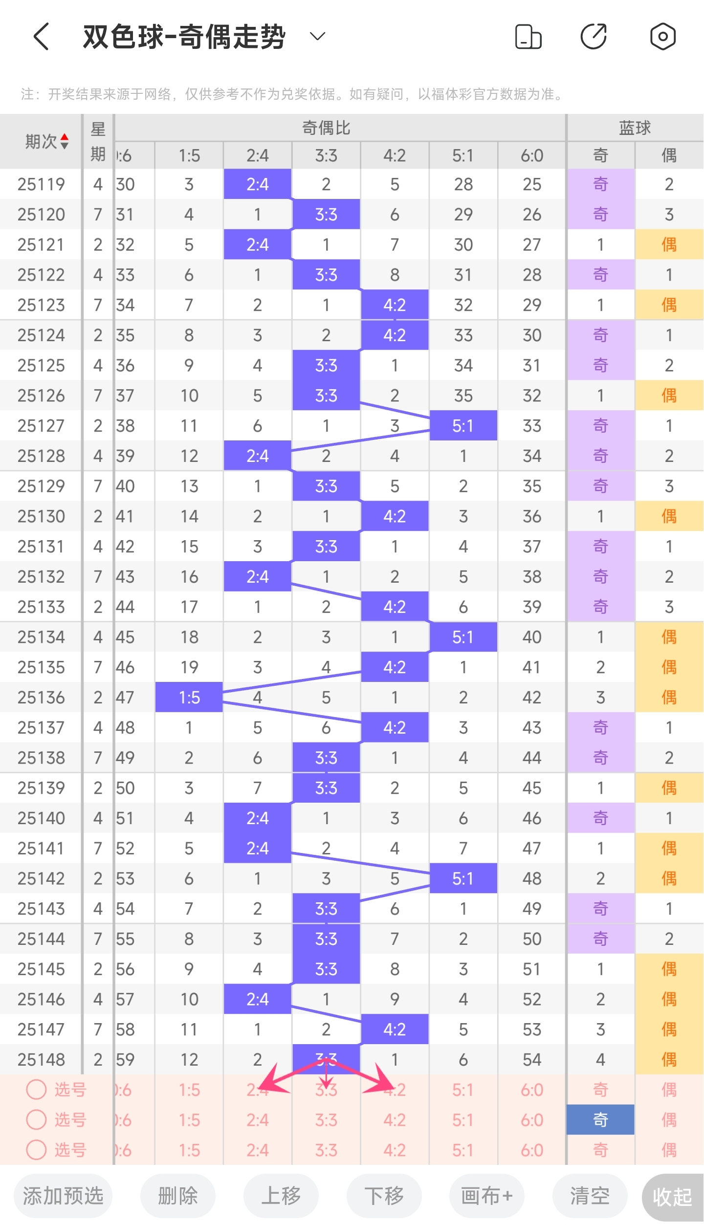 上期奇偶比为3:3,分别为奇偶奇偶奇偶。往前一期奇偶比为4:2。通过近30期内奇偶走势的数据分析,目前1:5奇偶比开出的概率是3.33%5:1奇偶比开出的概率是10%3:3奇偶比开出的概率是40%4:2奇偶比开出的概率是23.33%2:4奇偶比开出的概率是23.33%6:0奇偶比开出的概率是0%。与前一期相比,3:3概率变大,2:4概率变小。通过分析走势图,上期开了3:3奇偶比,本期还是看好3:3奇偶比。所以本期推测本期可能开3:3奇偶比,其次是2:4奇偶比或者4:2奇偶比,最后是1:55:1奇偶比。