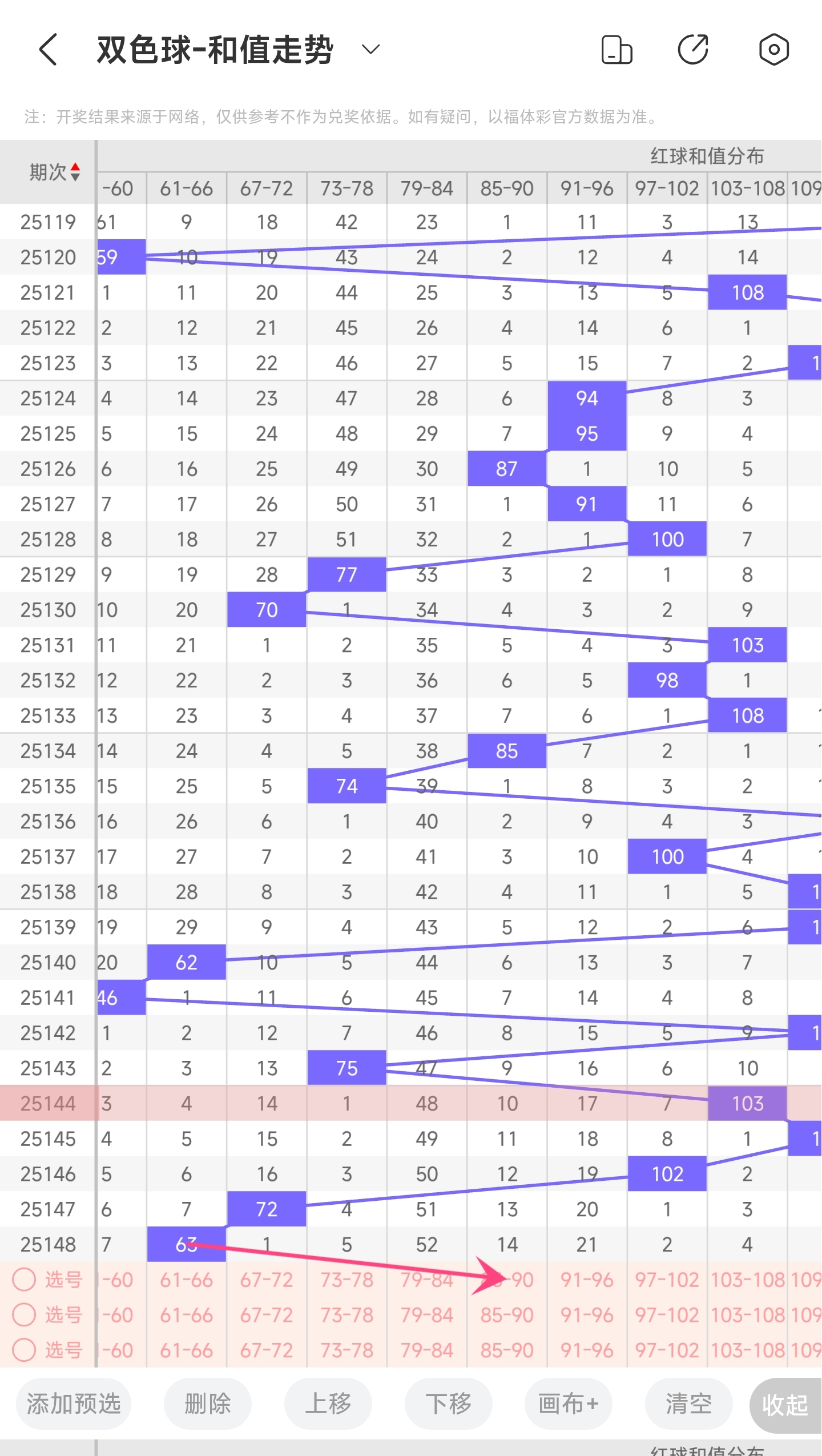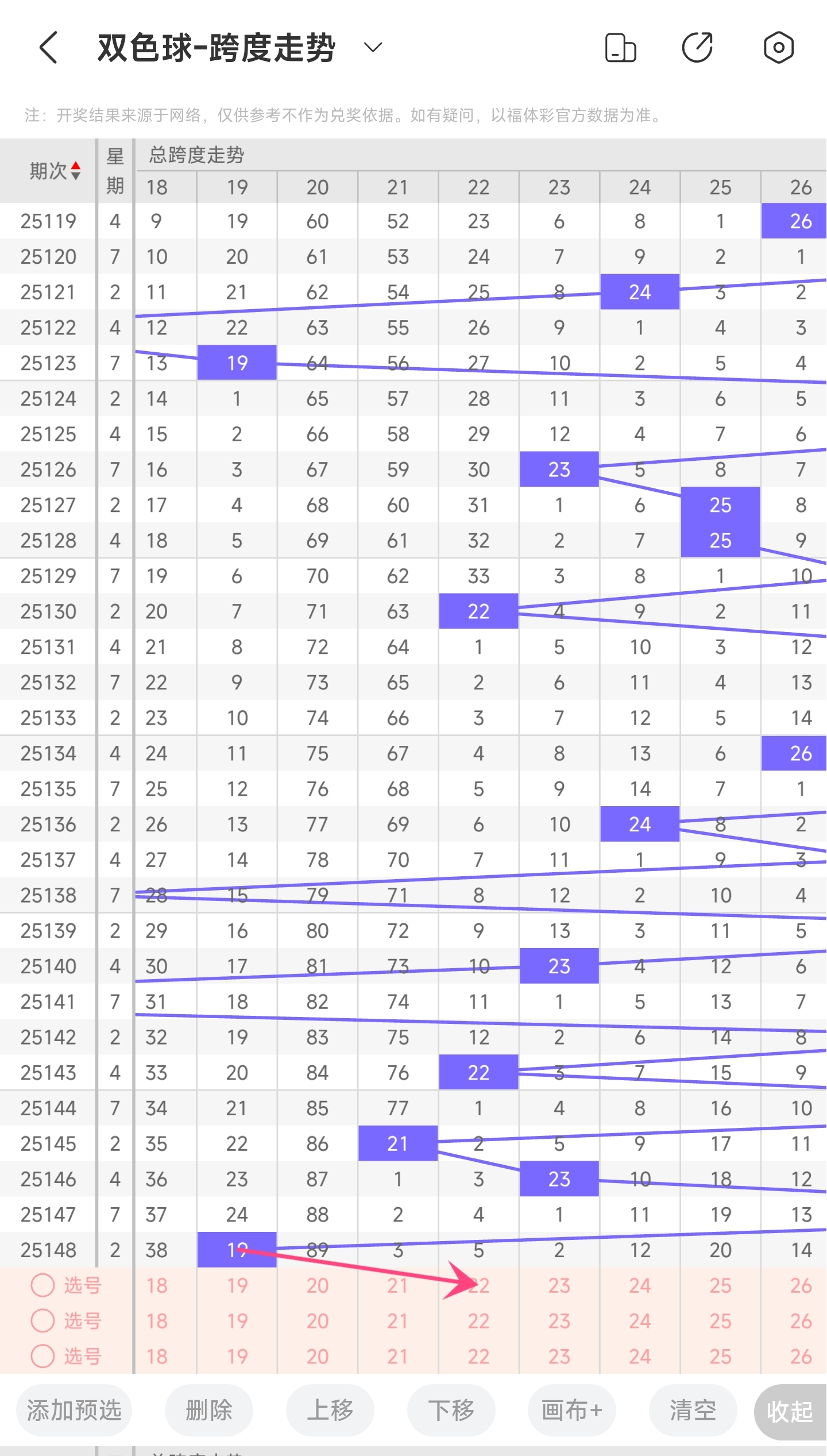 上期龙头为3,凤尾为22,跨度为19,往前一期跨度是32,偏移量为1319跨度值是30期内开出的很小的跨度值。上升的空间很大,下降的空间了,本期看好跨度变大,所以推测本期跨度趋势是往右的,跨度变大,小概率继续往左。