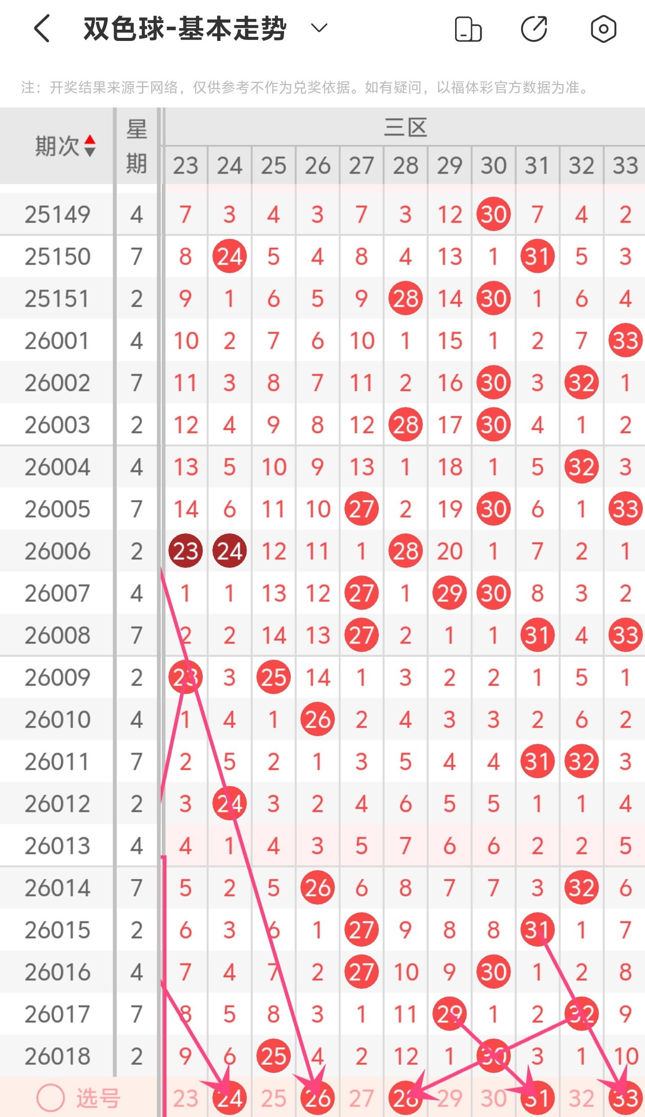 上期第三区间开出25 30,本期我们可以从上面走势图中看到选号的思路,24为斜连走势,26为斜连走势,28为斜连走势,31为斜连走势,33为斜连走势,综合以上分析本期第三区间推荐24 26 28 31 33