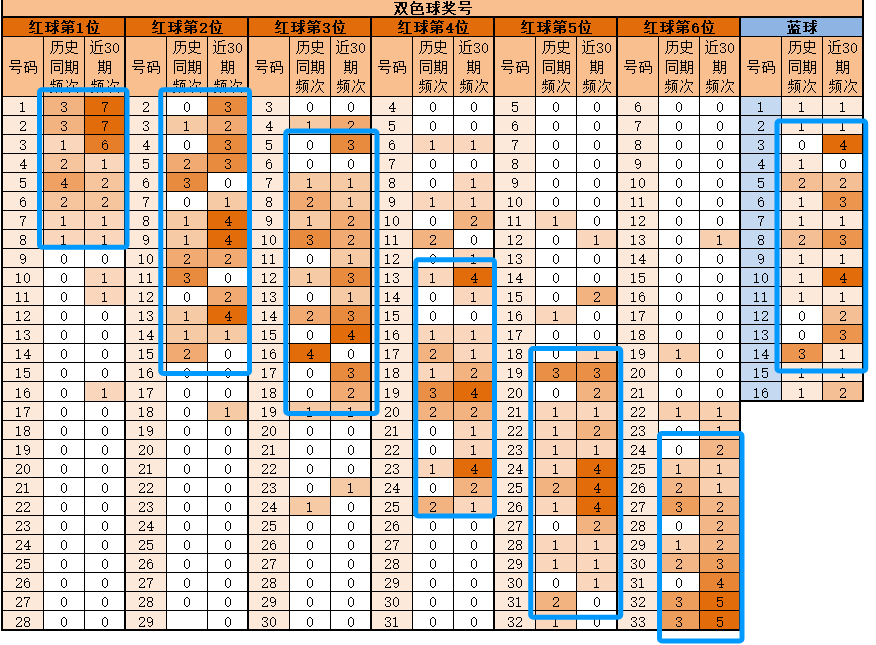 第6位,基本在24-33之间,历史同期频次最多的27-32-33;近30期,频次最多的为32-33,明显特征是合数优势;推荐重28-29-30-31-32-33。