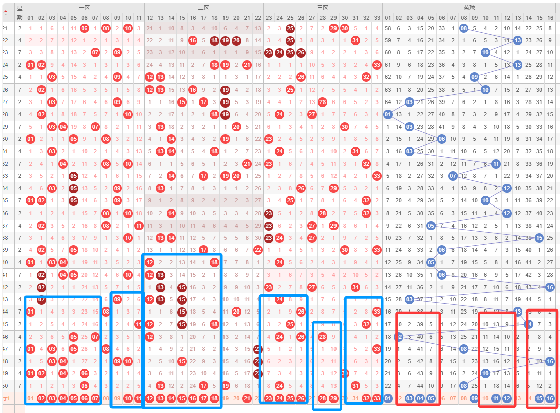 红球平均遗漏值小于5、遗漏期数已超过最大遗漏值的号码:红球1-2-3-4-5-8-9-10-13-15-19-21-23-24-25-26-32-33,预防1-2个更为稳妥;