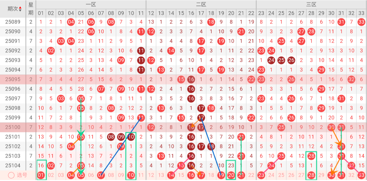 根据以上特点,我们对双色球第25105期进行如下分析: