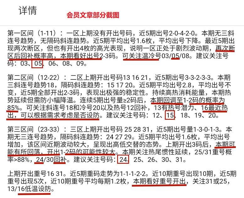 各位彩友可以根据需要购买,会员文章中每个区间给出了更加完整的思路参考,再结合自己的思路,提高命中率!