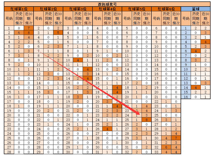 第6位,基本在24-33之间,历史同期频次最多的32;近30期,频次最多的为30,明显特征是合数优势;推荐重24-28-29-30-31-32-33。