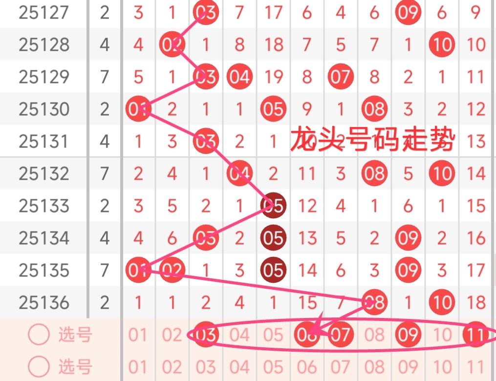 上期龙头号码为08,振幅上升了7点,开出偶数号码。从近期龙头号码走势来看,近期龙头号码波动频繁。上期龙头为08。观察近期龙头号码,小号码出现的频率相对较高,且多在01 - 10这个区间。从走势来看,号码有逐渐增大的趋势,但也需要防回落的可能。预计本期龙头号码可以重点关注03 - 11区间开出。本期还需关注遗漏值较高的号码,本期有望龙头号码热出的区域。综合考虑,本期龙头号码可重点关注03、06、07、09、11。