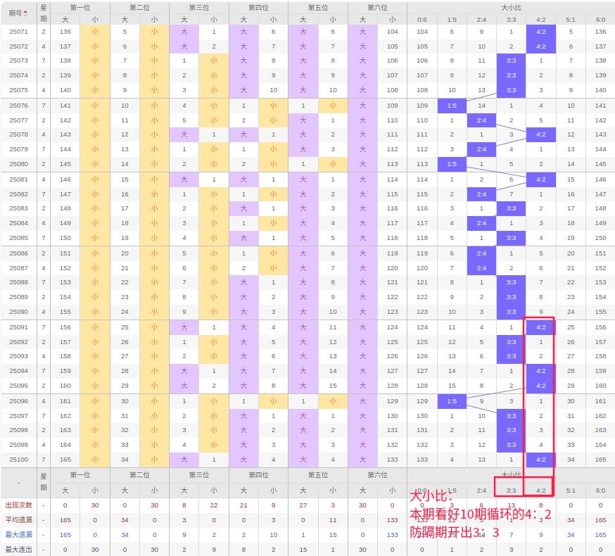 上期大小比:4:2,近10期大小比出现情况:3:3、4:2、3:3、3:3、4:2、4:2、1:5、3:3、3:3、3:3、4:2,最近10期出现5期3:3,出现4期4:2,出0期2:4,出现0期5:1,出现1期1:5,出现0期6:0,出现0期0:6,根据近10期规律本期看好10期循环的4:2,防隔期开出3:3,综上所述推荐大小比推荐:3:3,重点关注:4:2。