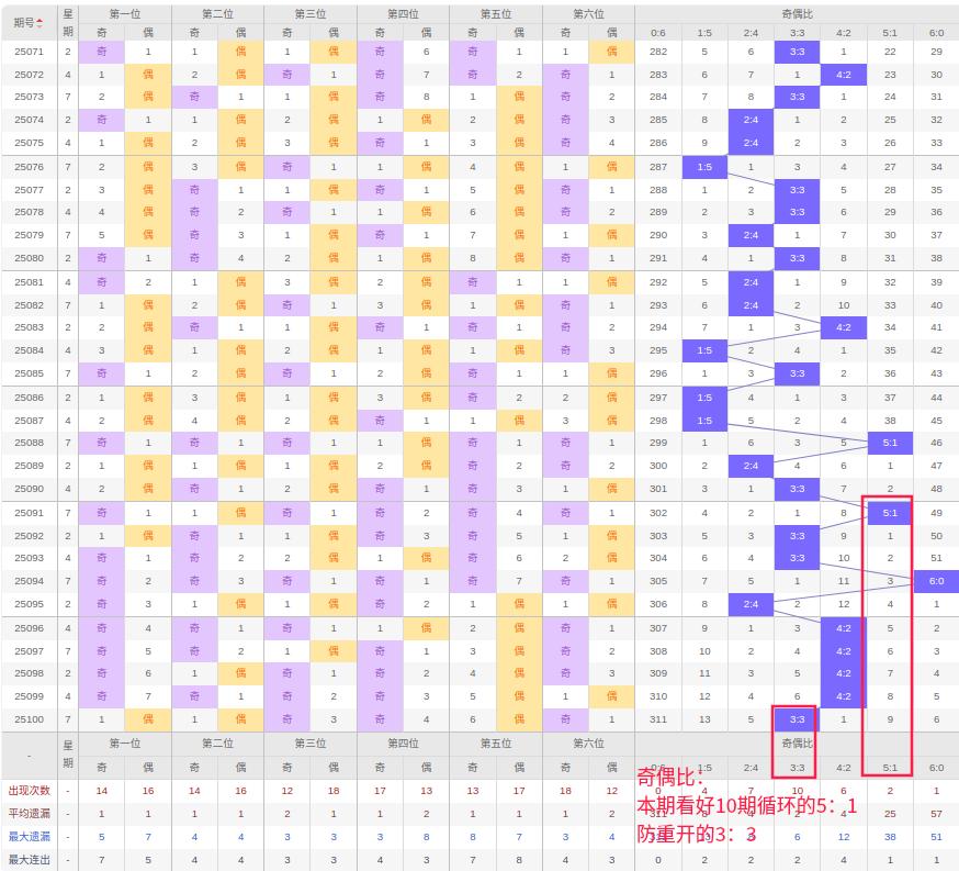 上期奇偶比:3:3,近10期奇偶比出现情况:5:1、3:3、3:3、6:0、2:4、4:2、4:2、4:2、4:2、3:3,最近10期出现4期3:3,出现4期4:2,出现1期2:4,出现1期5:1,出现0期1:5,出现1期6:0,出现0期0:6,根据近10期规律本期看好10期循环的5:1,防重开3:3,综上所述推荐奇偶比推荐:3:3,重点关注:5:1。