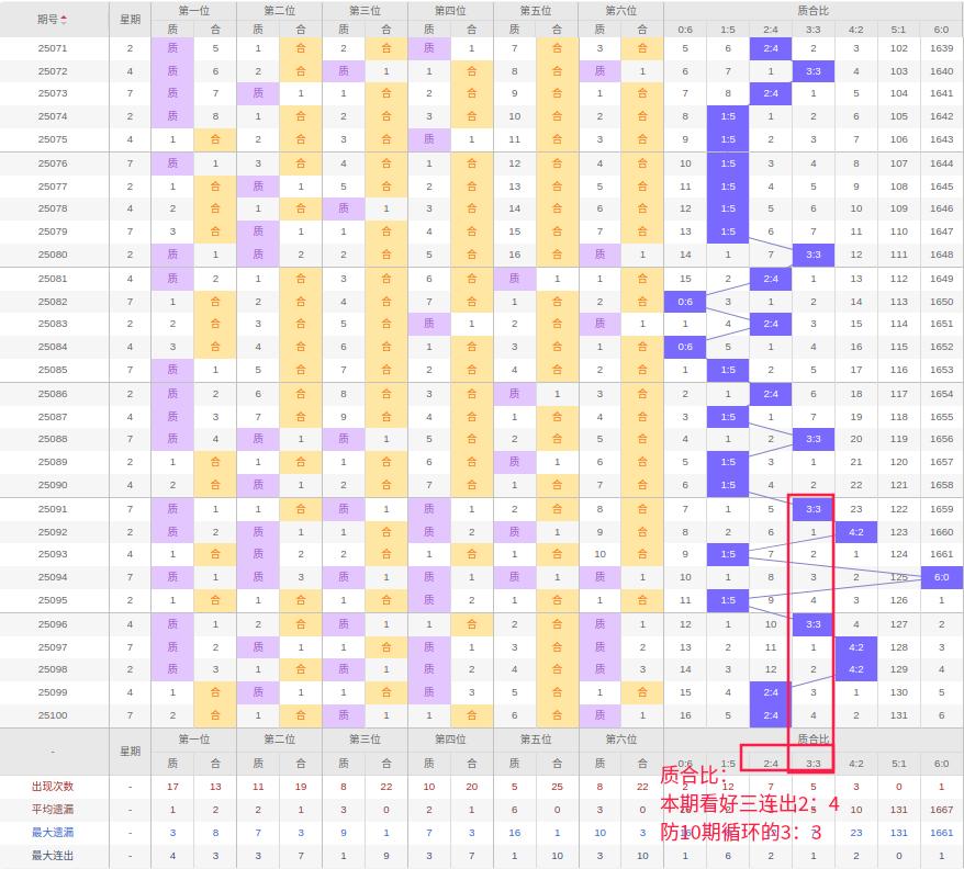 上期质合比:2:4,近10期质合比出现情况:3:3、4:2、1:5、6:0、1:5、3:3、4:2、4:2、2:4、2:4,最近10期出2期3:3,出现3期4:2,出现2期2:4,出现0期5:1,出现2期1:5,出现1期6:0,出现0期0:6,根据近10期规律本期看好三连出2:4,防10期循环的3:3,综上所述推荐质合比推荐:3:3,重点关注:2:4。
