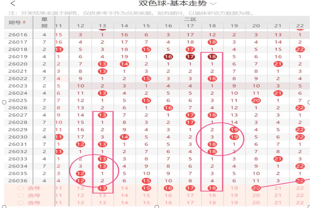 上期二区间开出3个【12,15,22】,重码1枚,本区间有2个大遗漏【16】遗漏10期,【20】遗漏11期.上期开出3个球,本期看2-3枚,主看【13,15,16,17,18,20】