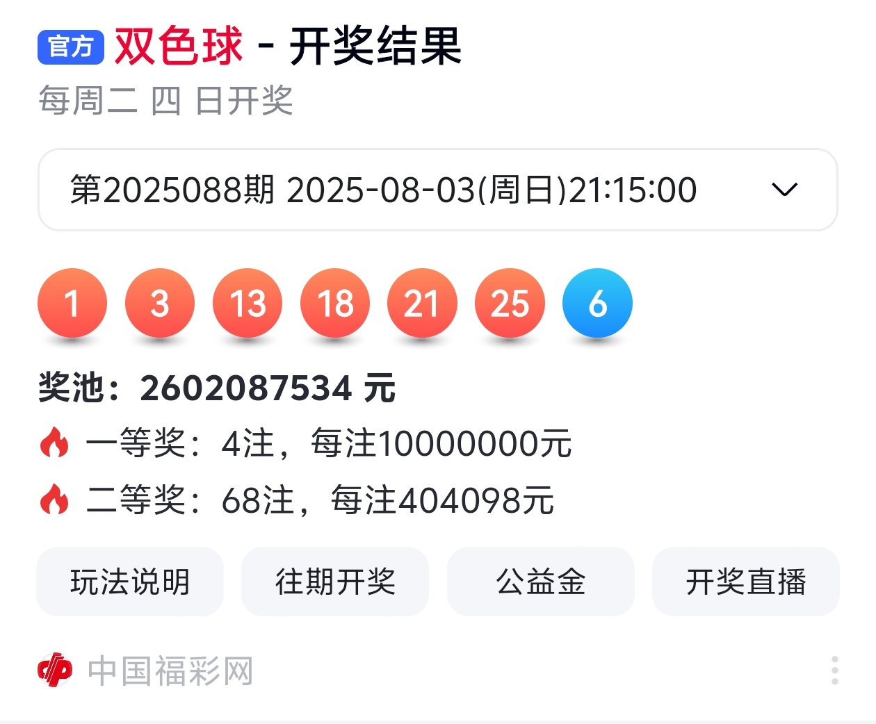 下面是我对2025089期福彩双色球的分析和预判,希望通过我的分析能让大家今晚大红!福彩双色球上期开奖号码如下图: