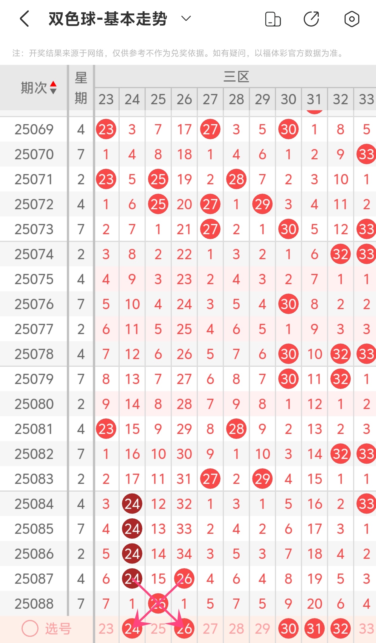 上期第三区间开出25,本期我们可以从上面走势图中看到选号的思路,24为斜连走势,26为斜连走势,综合以上分析本期第三区间推荐24 26 30 31 32