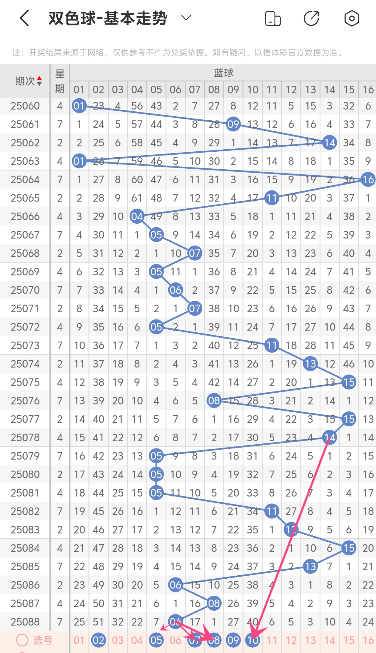 上期蓝球开出06,本期我们可以从上面走势图中看到选号的思路,05为分边走势,07为分边走势,08为隔期回补走势,10为斜连走势,综合以上分析本期蓝球推荐05 07 08 09 10