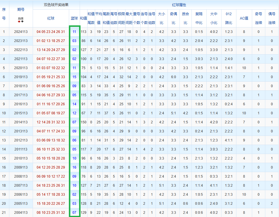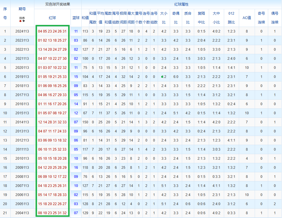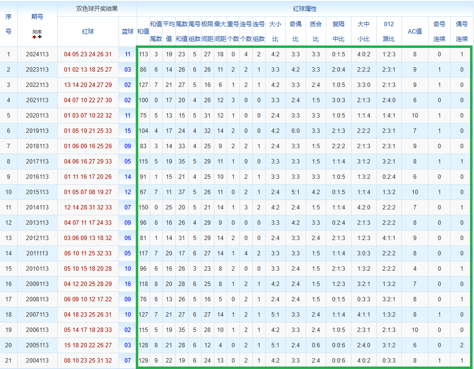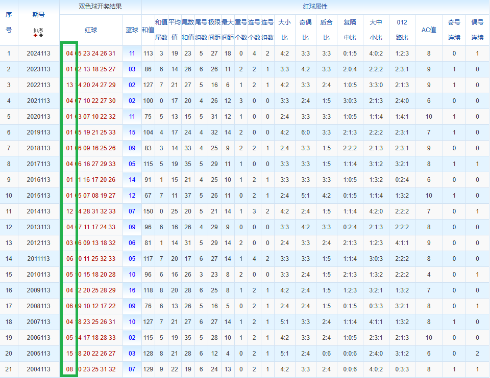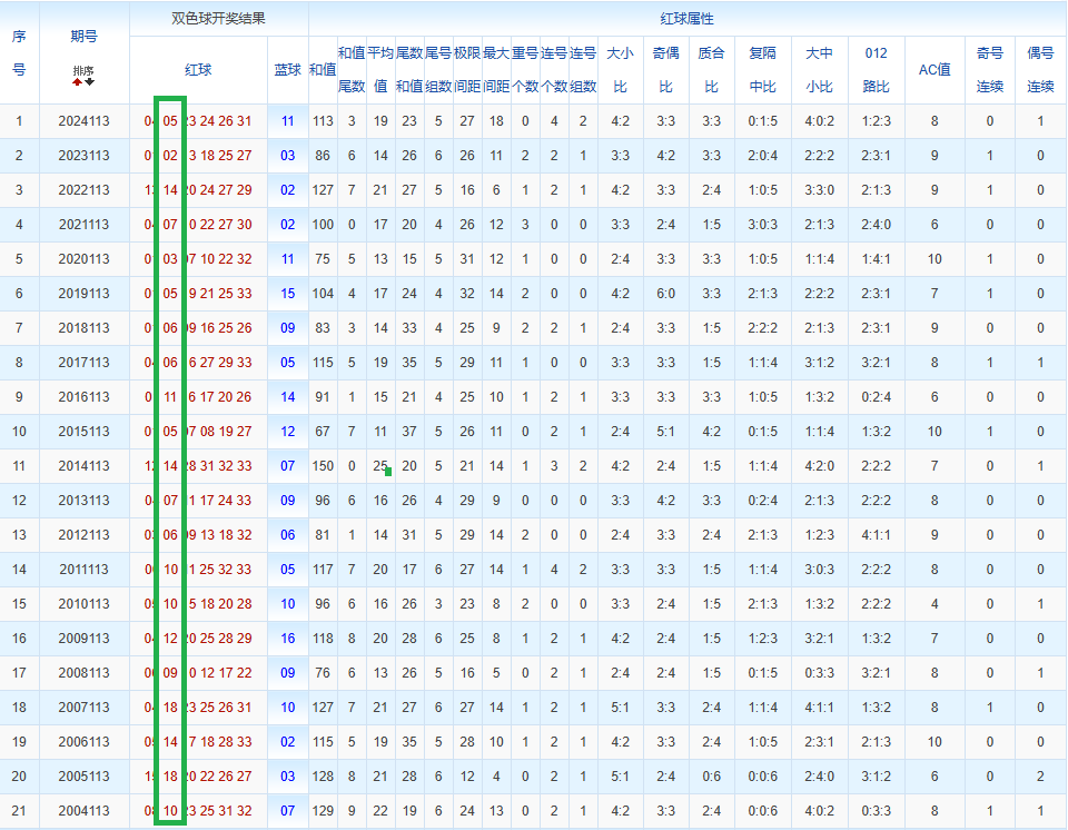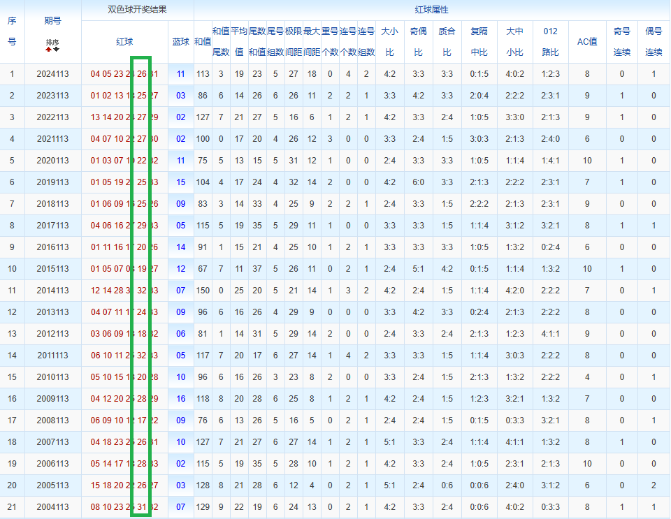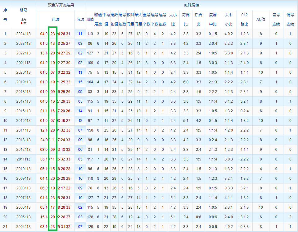通过观察,我发现双色球往年同期的开奖数据与本期号码之间存在显著关联。具体来说,在红球中,从第一位至第六位,通常会有约4个位置上的数字与往年同期相同位置的号码一致;而蓝球号码中,也有多期开奖结果直接包含了往年同期的数字。因此,我们可以借助往年同期各位置上的号码,作为分析本期开奖情况的重要依据。在此基础上,还可结合往年同期的其他相关条件,进行综合性的号码组合推荐。
