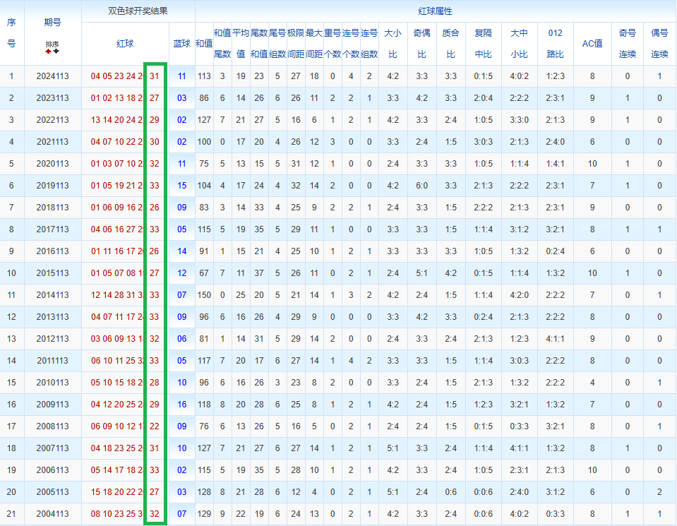 往年同期中选取出现次数靠前的数作为我们的分析对象,其数据有:25 33 27 18 10 04 01 等