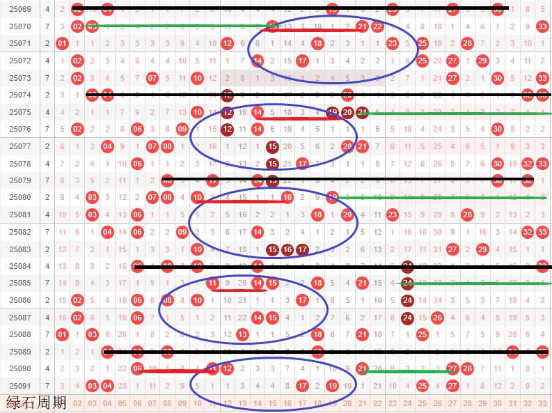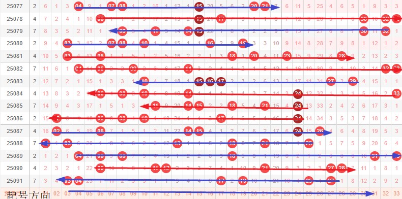 如图所示:首尾制约平衡组范围依次为:拉推推,缩推? 本期形态范围优先选择红色压缩。由于上期号码处在2组连号的分割,是利用交换首尾,还是不交换首尾体现的首尾形态不一样,本期优选红色压缩3-27选号,次看右推4-33选号。