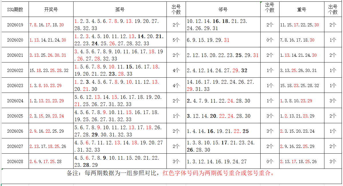 如图,以近两期数据为一组,进行对比分析。相同的孤号、邻号,可能在下期出1-4个左右。上期开出孤号3个,邻号0个,重号3个。本期参考孤号:4.11.12.13.14.15.19.20.21.22.23.30.31.32.33;邻号:1.3.5.7.8.10.16.18.24.26.27.29;孤、邻号重合号码精选:***(会员专区可见)。个人分析,仅供参考。
