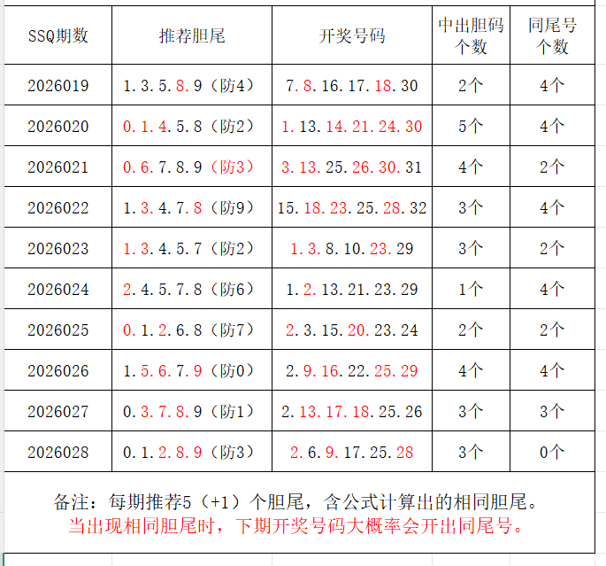 如图,每期推荐胆尾中出1-4个。上期推荐胆尾中出3尾3码!推荐胆尾是按照公式计算的顺序,不定位红球号码的顺序。本期推荐胆尾:4尾/8尾/9尾/2尾/0尾 。加推重点胆尾:***(会员专区可见)。推荐胆码号码:***(会员专区可见)。个人分析,仅供参考。