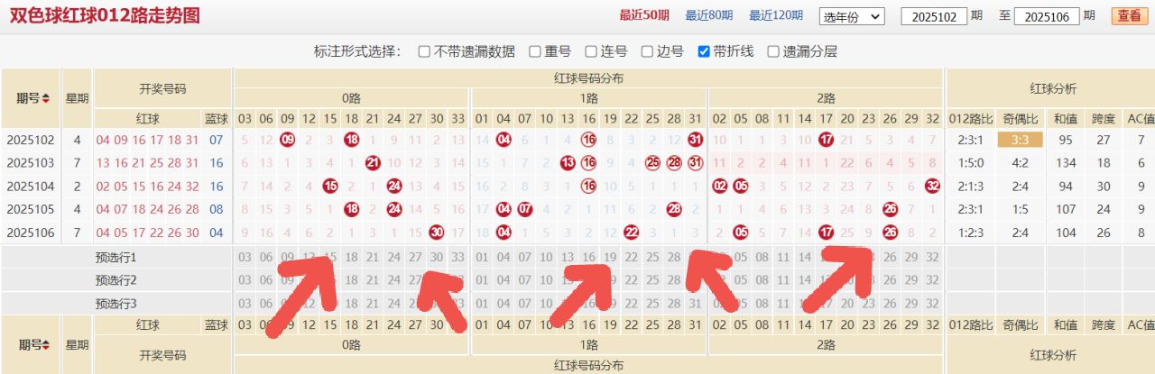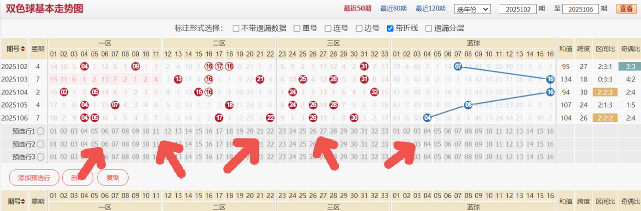 上期双色球的开奖号码为:04 05 17 22 26 30+04,和值为104,跨度为26,区间比例为2:2:2,奇数偶数比例为2:4,012路比例为1:2:3,上期双色球的整体热度达到了一个平衡状态,不过实际上近期双色球热度的波动也不是说特别大,但是在一区和二区的间隔这一块还是比较远的,本期对于遗漏趋态这一块的整体回补可能需要重点关注,这是本期双色球的初始基本思路。