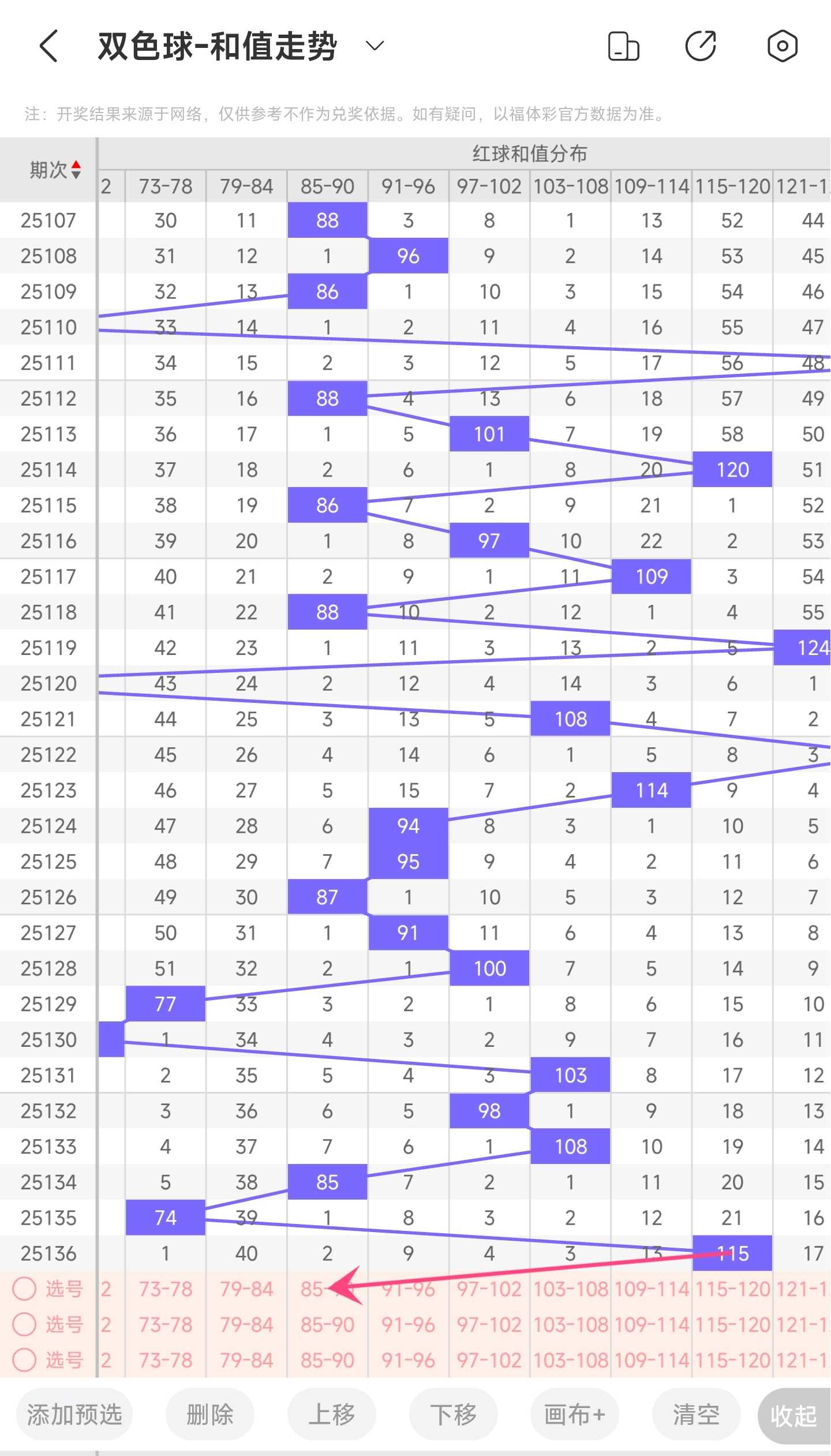 上期和值为115,而近5期和值为,98,108,85,74,115,上期和值较前一期增加了41,振幅为41。115和值是属于近30期内开出的比较大的和值,上升的空间比较小,下降的空间很大。本期看好和值变小,所以推测本期和值趋势是大概率往左,和值变小,小概率继续往右,和值变大。