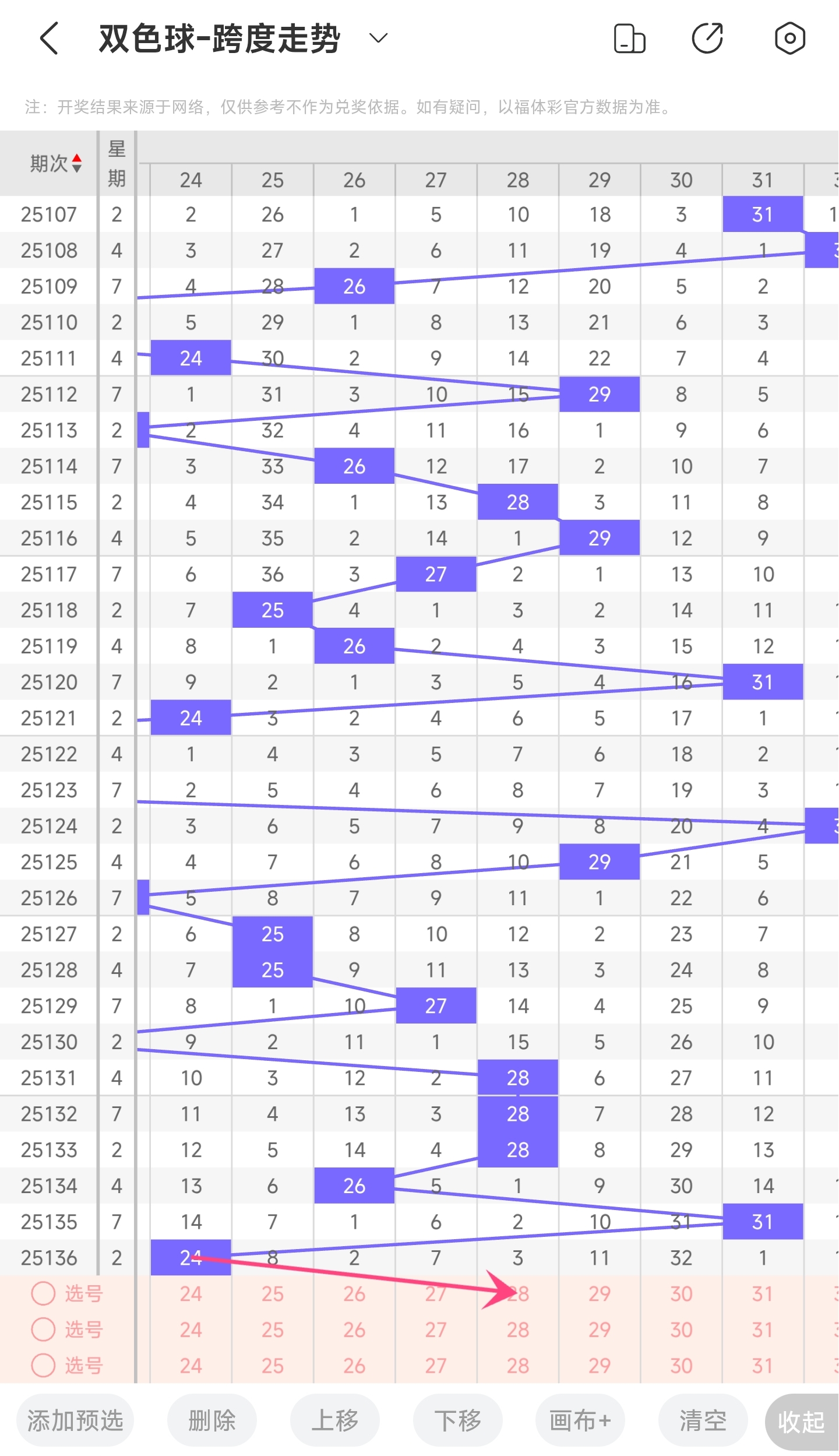 上期龙头为8,凤尾为32,跨度为24,往前一期跨度是31,偏移量为7。24跨度值是30期内开出的比较小的跨度值。上升的空间比较大,下降的空间比较小,本期看好跨度值变大,所以推测本期跨度趋势是往右,跨度变大,小概率往左,跨度值变小。