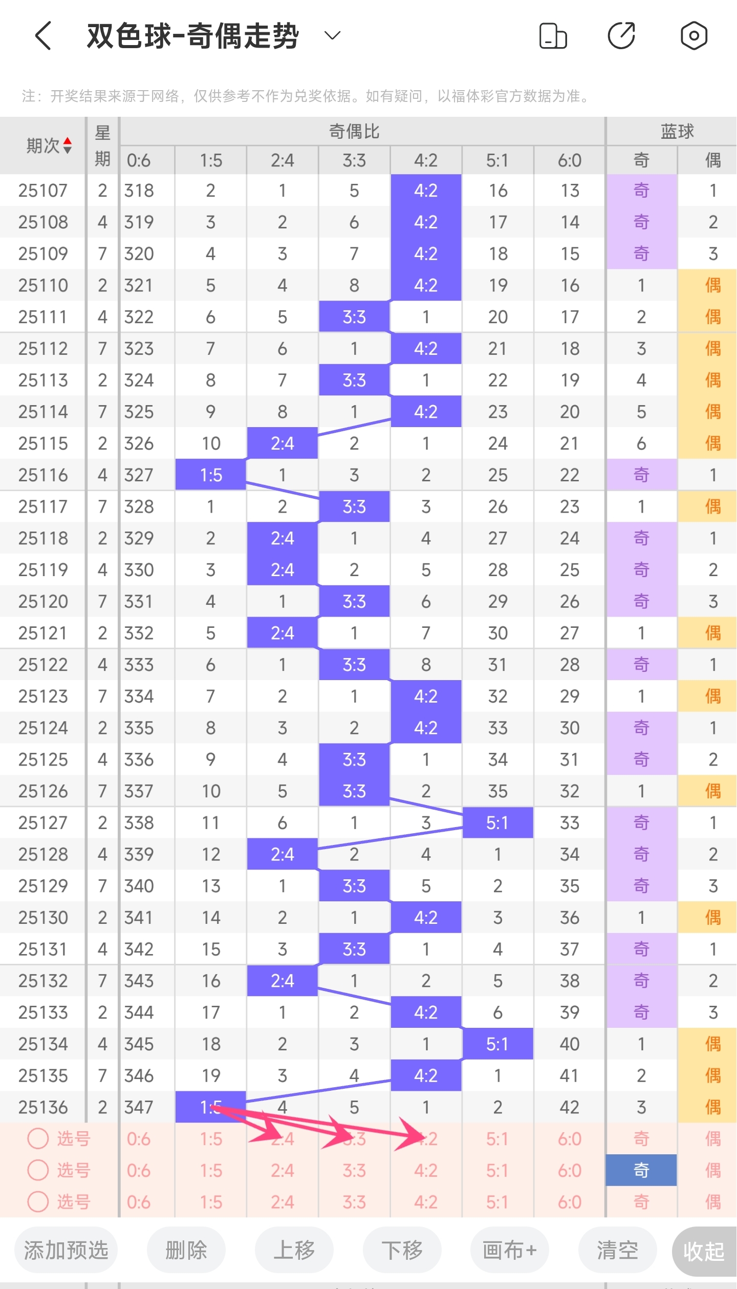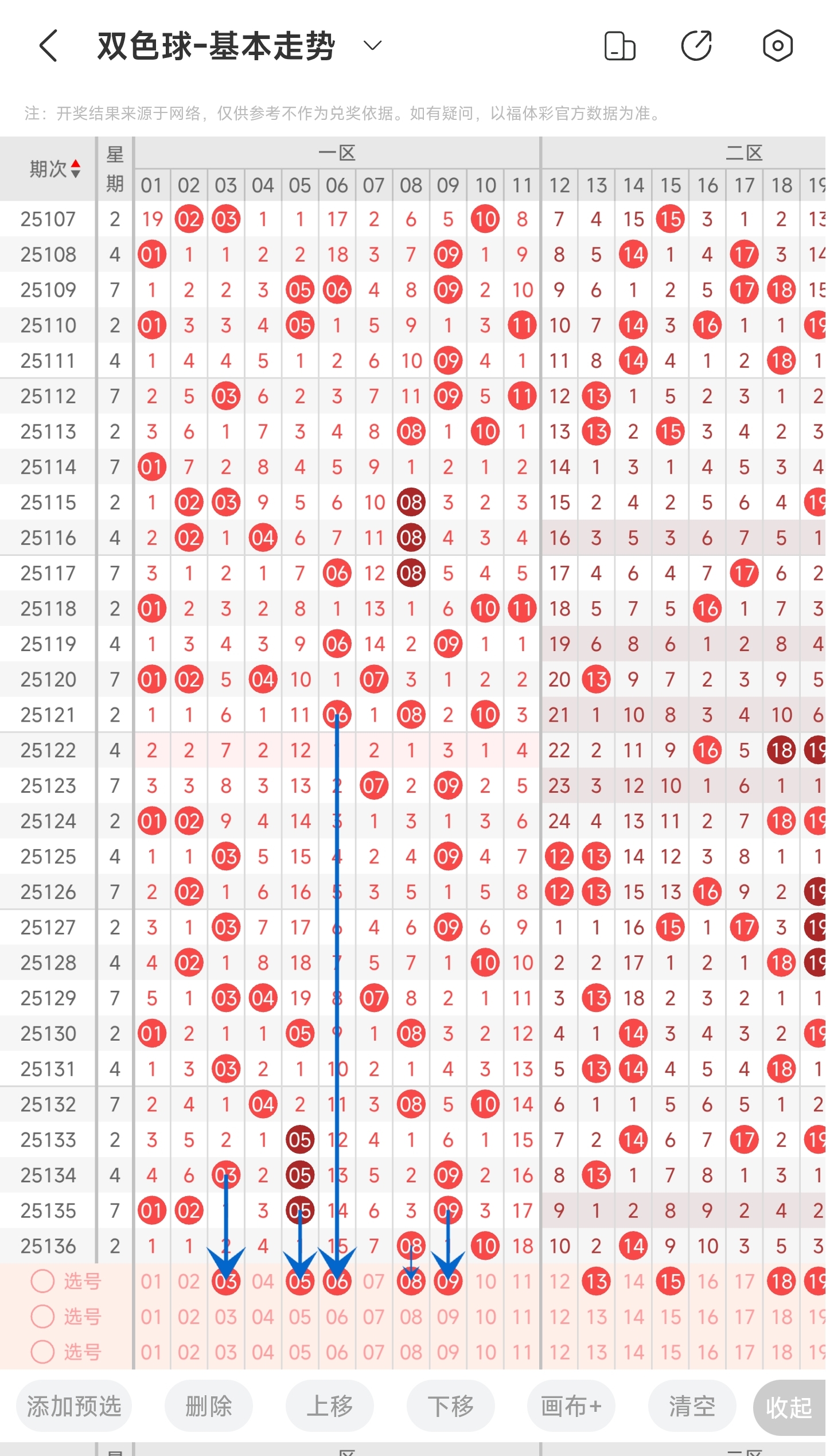 上一期三区开出了23,28和32号球。往前一期出了25和32号球。通过走势图分析,上期凤尾开在了右边的位置,最近2期都是开了右边,本期可能继续开,但也可能回补中间和左边,尤其是左边要重点关注一下。最后再结合冷热号和遗漏期数,本期我们可以关注24,25,26,31,33等号。综上所述本期我们推测有可能开出24,25,26,31,33等号码。
