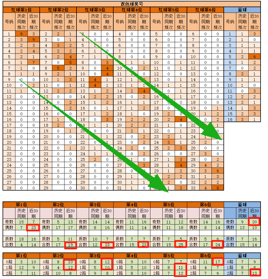 第6位,基本在21-33之间,历史同期频次最多的为29-33;近30期,频次最多的为33,明显特征是合数和0路优势;推荐重点30-31-33。