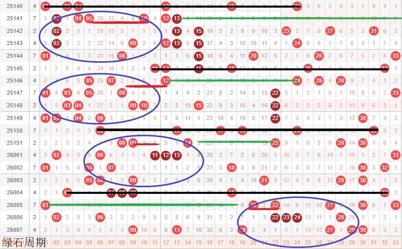 如图所示:体现的是3个局部走势的发展周期,圆圈为密集处的填空,本期定性为新局部走势5期,架构填空第2期,主力填空第3期,本期走势结束期大小均衡或者小号多开,体现横码或重号走势。