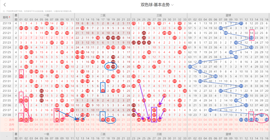 上一期一区开出了1个号码,本期一区断区的可能性小,本期一区出号数量可以考虑2个,防3个;本期一区需要关注的号码:01遗漏值5-4-3呈现出递减的走势;02为隔期码;02-03可能会一起落号;08为隔期码;09与10-11形成了斜连走势;本期一区选号范围为:01-02-03-08-09等号码。