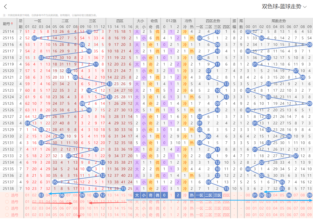 上期开出大号奇数15,从走势上号码整体分布结合折线运行轨迹本期蓝球重点关注五码03 06 09 11 12参考。有关更多详细选号思路以及号码组合搭配 我们15:00~17:30点有选号思路详细解析的直播节目欢迎大家前来一起探讨交流。