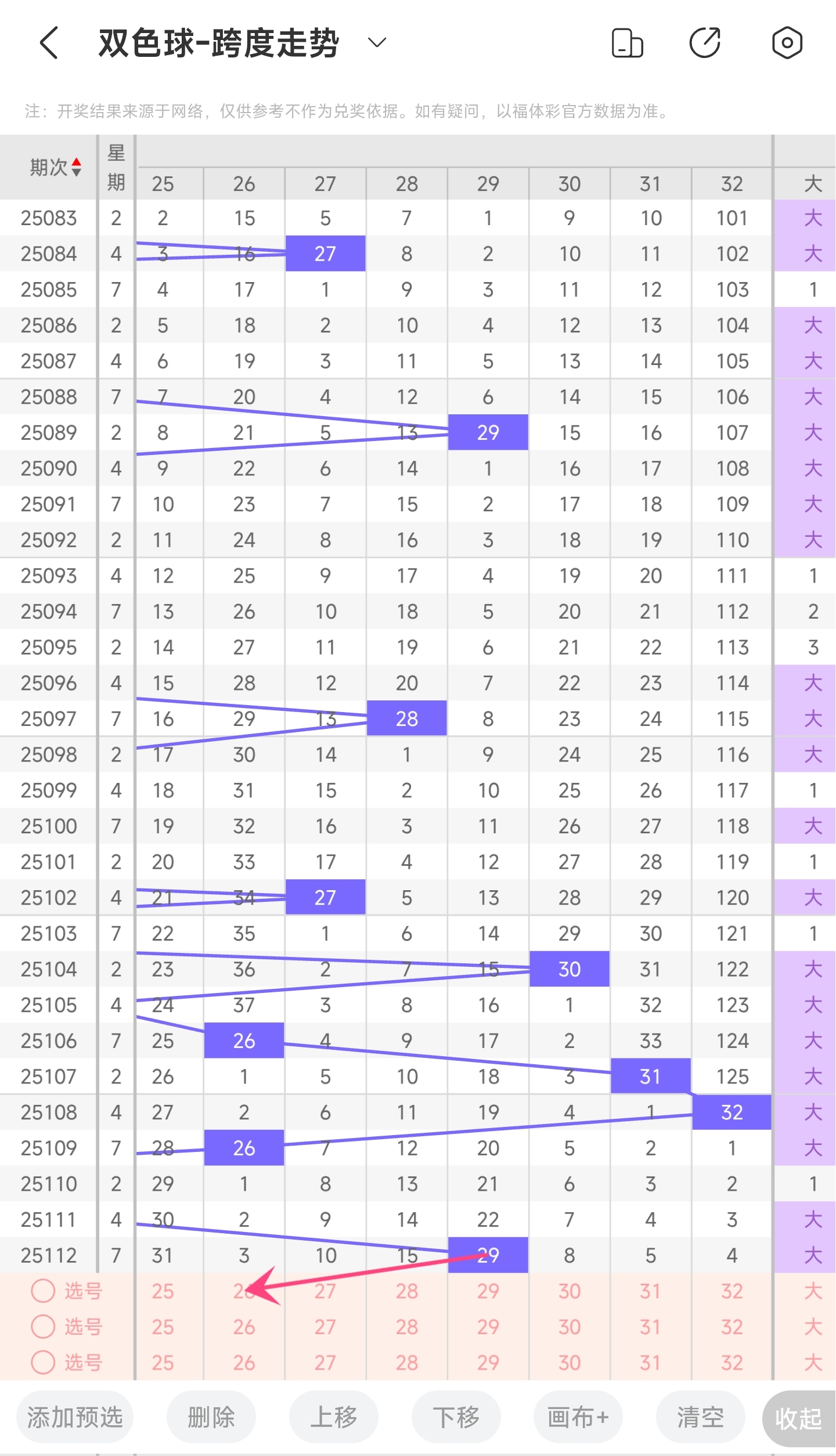 上期龙头为03,凤尾为32,跨度为29,往前一期跨度是24,偏移量为5。29跨度值是30期内开出的比较大的跨度值。上升的空间比较小,下降的空间很大,因为上期龙头较小,凤尾较大,所以跨度比较大,目前龙头凤尾依旧可能继续开较小和较大的号,所以跨度有可能小幅度提升,但更大的概率是变小。所以推测本期跨度有较大可能是跨度变小,趋势往左,小概率往右,跨度变大。