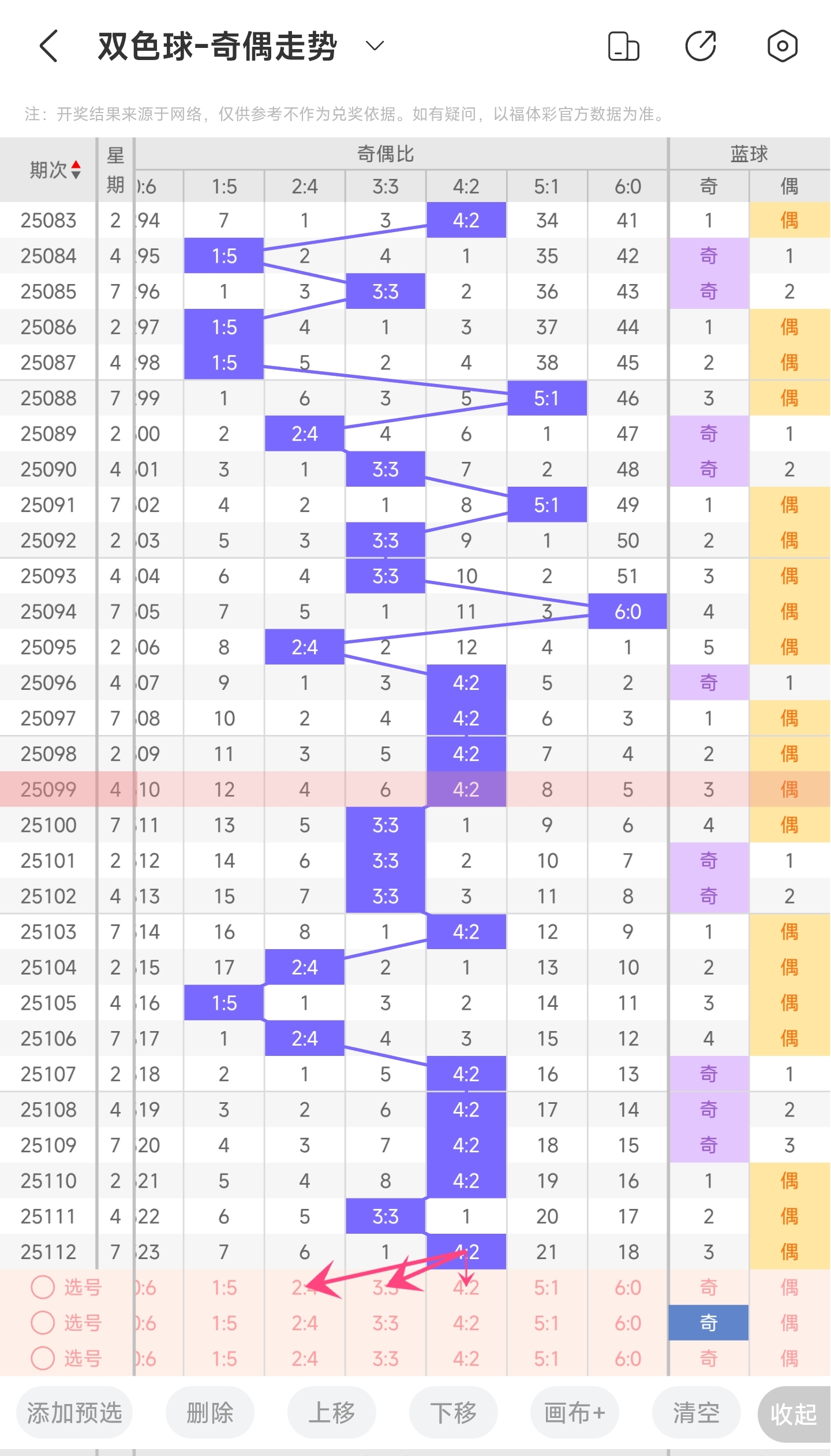 上期开出的是02,往前一期开出的是12。趋势往左偏移,偏移量为10。通过分析目前蓝球的走势图,目前的趋势是目前的趋势是比较明显往右的了。走势的话近几期走势都是比较陡的,偏移量也比较大,所以本期我们主要关注较大偏移量的号码,其次是较小偏移量的号码。再结合遗漏期数,以及冷热号,本期我们可以关注06,08,09,11,13,14等号码。综上所述本期推测可能开出06,08,09,11,13,14等号码。