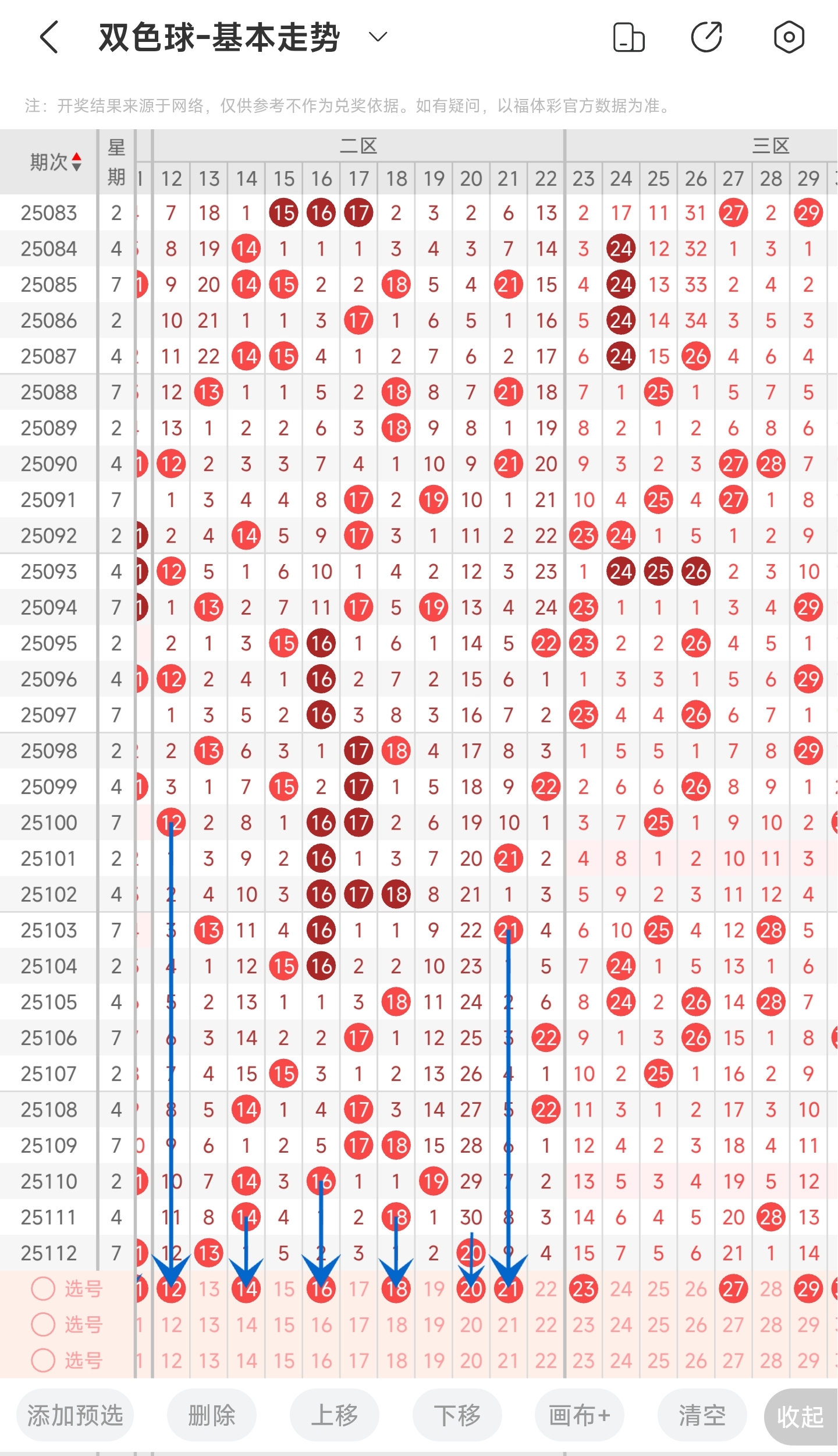 上一期二区开出了13,20等号码。往前一期开出了14,18。通过分析走势图,可以看到上期开出的13和20号球,分别是在左边和右边的号码。往前几期开出的号码都是比较靠近中间的,所以目前有往左右两边开的趋势,所以本期我们主要关注左右两边的号码,但中间的号码也要有所防备。最后结合冷热号和遗漏期数,本期我们可以关注一下12,14,16,18,20,21等号码。综上所述推测本期可能开12,14,16,18,20,21等号码。