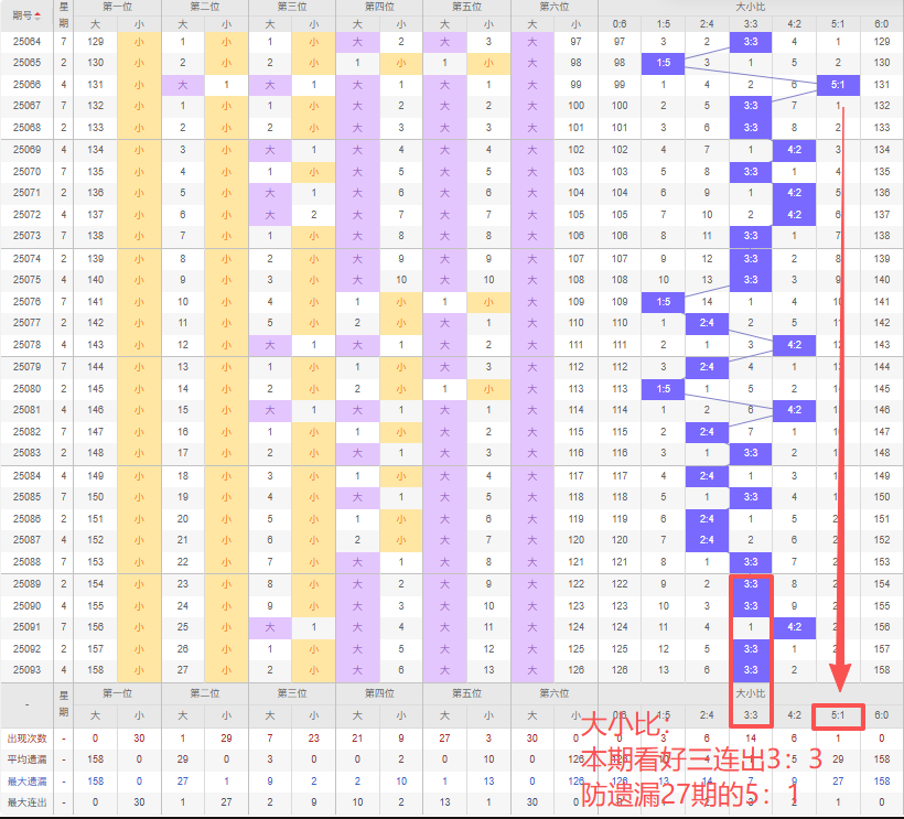 上期大小比:3:3,近10期大小比出现情况:2:4、3:3、2:4、2:4、3:3、3:3、3:3、4:2、3:3、3:3,最近10期出现5期3:3,出现2期4:2,出3期2:4,出现0期5:1,出现0期1:5,出现0期6:0,出现0期0:6,根据近10期规律本期看好三连出3:3,防遗漏27期的5:1,综上所述推荐大小比推荐:5:1,重点关注:3:3。