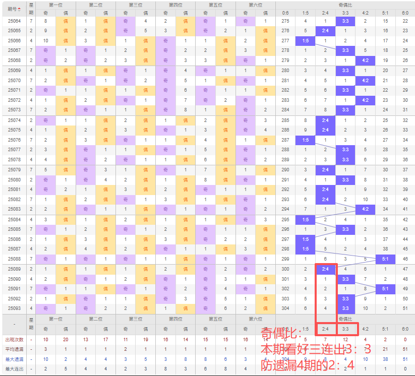 上期奇偶比:3:3,近10期奇偶比出现情况:1:5、3:3、1:5、1:5、5:1、2:4、3:3、5:1、3:3、3:3,最近10期出现5期3:3,出现0期4:2,出现1期2:4,出现2期5:1,出现3期1:5,出现0期6:0,出现0期0:6,根据近10期规律本期看好三连出3:3,防遗漏4期的2:4,综上所述推荐奇偶比推荐:2:4,重点关注:3:3。