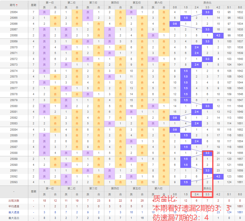 上期质合比:1:5,近10期质合比出现情况:0:6、1:5、2:4、1:5、3:3、1:5、1:5、3:3、4:2、1:5,最近10期出2期3:3,出现1期4:2,出现1期2:4,出现0期5:1,出现5期1:5,出现0期6:0,出现1期0:6,根据近10期规律本期看好遗漏2期的3:3,防遗漏7期的2:4,综上所述推荐质合比推荐:2:4,重点关注:3:3。