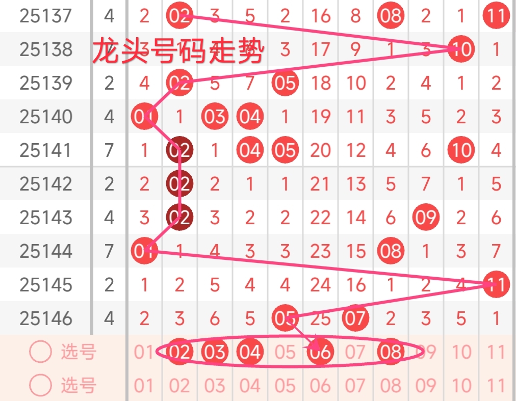 上期龙头号码为05,振幅下降了6点,开出奇数号码。从近期龙头号码走势来看,近期龙头号码波动频繁。上期龙头号码为05,为奇数号码。从近期龙头号码的走势来看,号码主要集中在红一区号码区间。本期龙头号码有望继续在这个区间产生,考虑到奇偶均衡的趋势,本期偶数龙头号码的可能性较大,预计本期龙头号码可能在01 - 10之间。本期还需关注遗漏值较高的号码,本期有望龙头号码热出的区域。综合考虑,本期龙头号码可重点关注02、03、04、06、08。