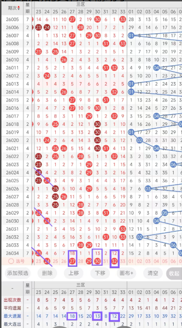 在近20期内开出了重号次数较多,其中23号、25号、30号连续开出了三重号及以上,已经是三区出现的重号连续期数最高的了,可见三区重号几率高,上一期开出的号本期更看好重号看好23号继续开出。邻号可以考虑24号。最后27号和30号以及33号都遗漏期数已经有10期以上,且已经达到其本身的最大遗漏期数,可以考虑防冷号开出。29号可以作为隔断号开出,若开出将形成1-6-1的形态。