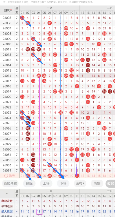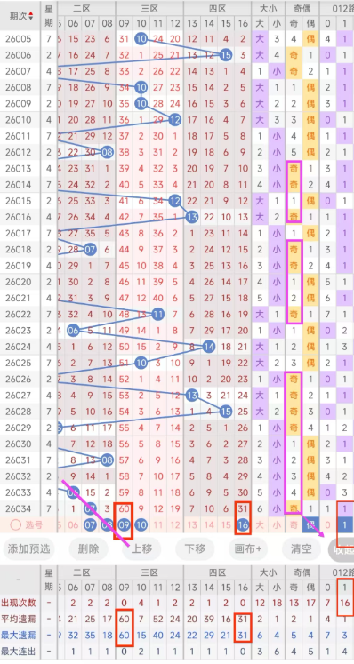 一区本期选号建议首先考虑遗漏期数较大的号,04号、08号都达到了遗漏十期以上且已到达其最大遗漏期数,是目前一区遗漏期数最大的号建议防冷号开出,06号和08号也是上一期开出的07号的邻号。11号本期若开出将形成1-2的形态。