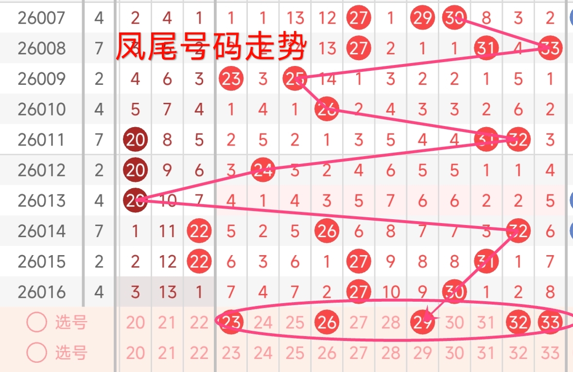 上期凤尾号码为30,振幅下降了1点,开出了偶数号码。回顾近期凤尾号码,振幅波动较大。上期凤尾号码为30,处于较高位置。从近期凤尾号码的走势来看,号码波动较大。近期凤尾号码主要集中在红二区与红三区之间波动。预计本期凤尾号码大概率会在23 - 33区间开出。32和33在历史凤尾号码位置出现频率相对较高,是比较热门的选择。本期还需关注遗漏值较高的号码,有望在本期回补开出。本期凤尾号码可重点关注23、26、29、32、33。