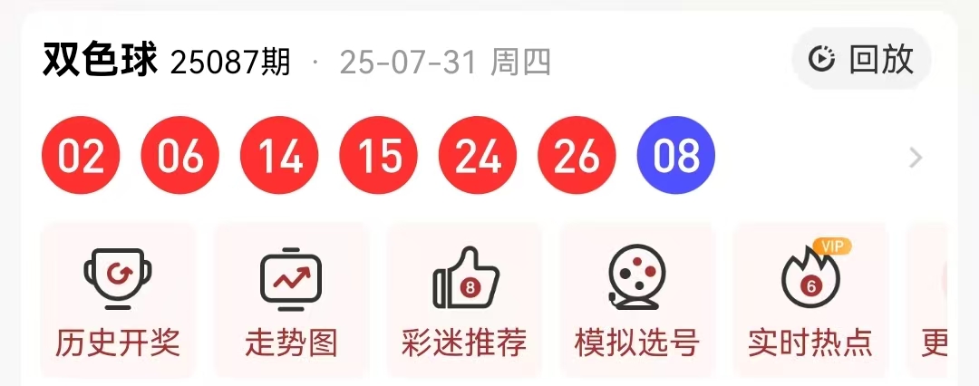 先来回顾一下第2025087期的双色球开奖结果:02 06 14 15 24 26+08,以下是对本期数据的详细分析: