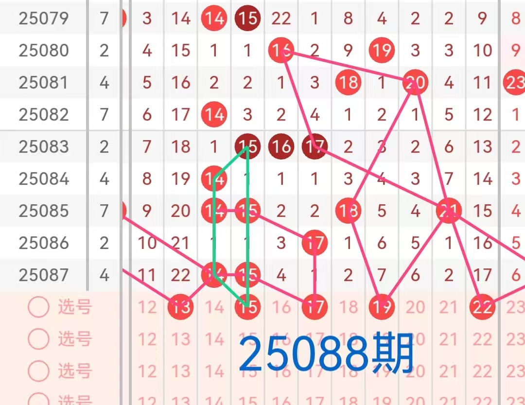 2. 第二区间(12-22):此区间在上期开出两个号码14和15。号码14和15在相隔一期后再次同时开出,根据走势来看这与2025085期走势出号大幅度相同。从历史数据来看,该区间内的号码近期出现频率较低,预计本区间会有号码继续开出,博士认为该区可能出2-3个号码,本期可关注号码13、15、17、19、22