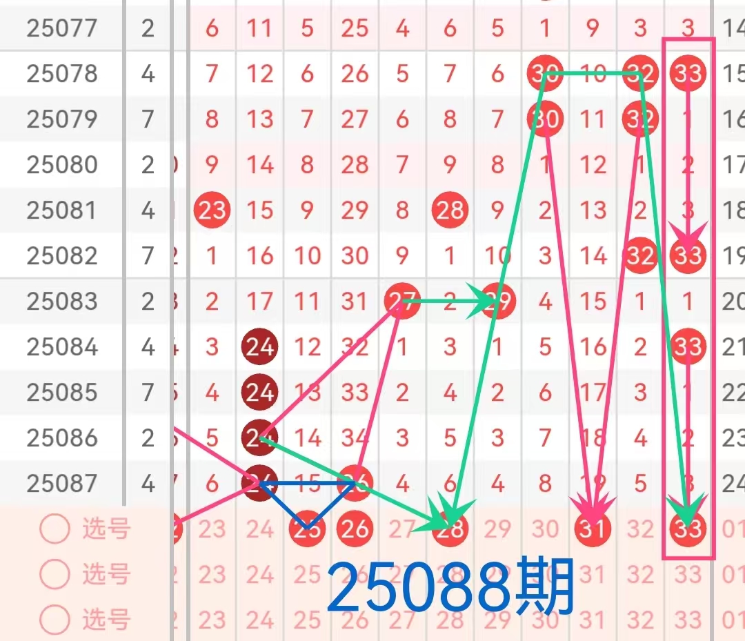2.凤尾分析:上期凤尾为26,本期预计凤尾会有上升,重点关注25、28、31、33这四个号码。