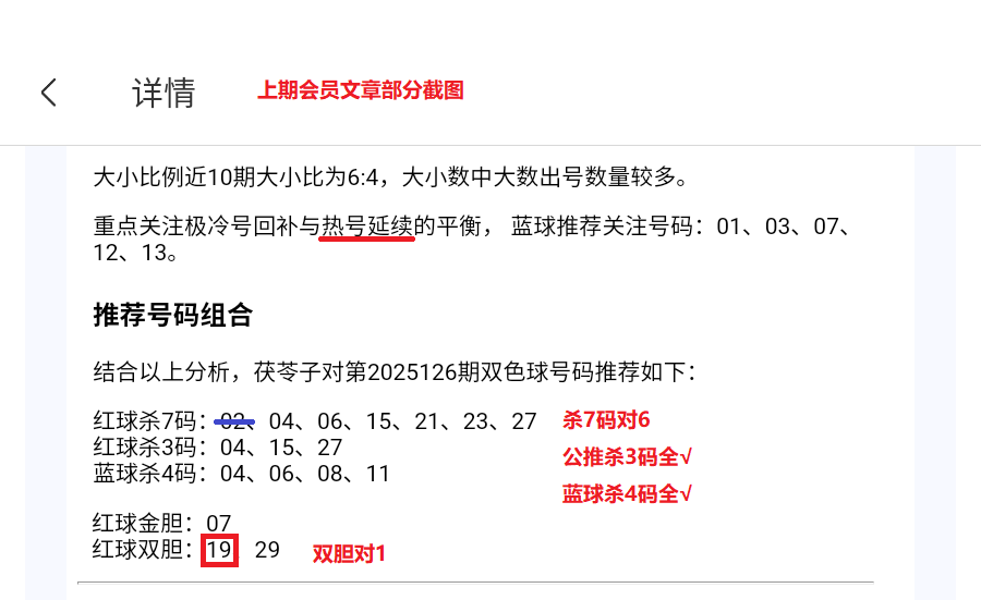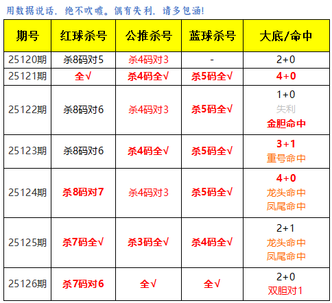 上期红球杀7码对6,免费文章杀3码全对,蓝球杀4码全对,双胆对1,上期红球命中2码,本期再接再厉!