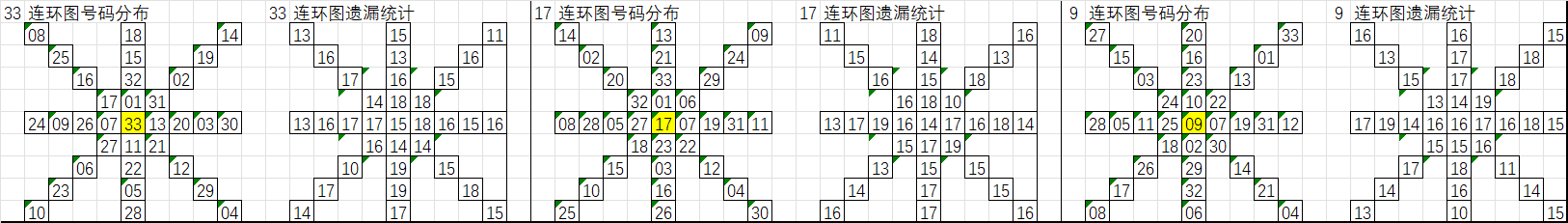由于数据量大,不一一统计,下图为各个号码分别在33、17、9连环图上的遗漏统计汇总图: