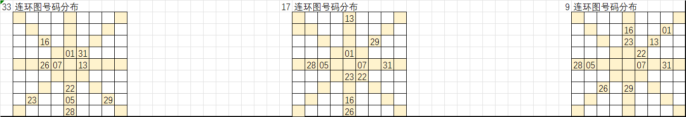以上是33、17、9的连环图,可以在一起彩平台的九转连环图中查看历期号码分布,以当前期数来看,历史同期共有19期(2003-2023),那么我们就以19期号码来进行遗漏统计,然后把每个号码在近19期的遗漏总数统计出来,分别带入33、17、9的连环图,取出遗漏值大于16的号码,把这些号码在“环上”和“轴上”的相邻号码取出来进行统计,选取出次前15的号码作为大底。